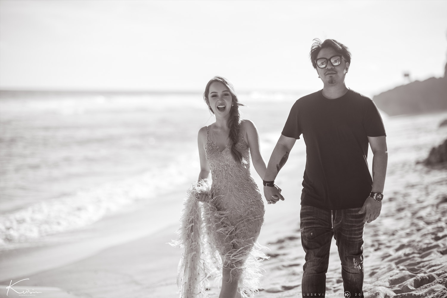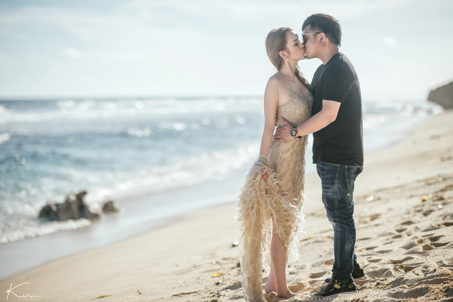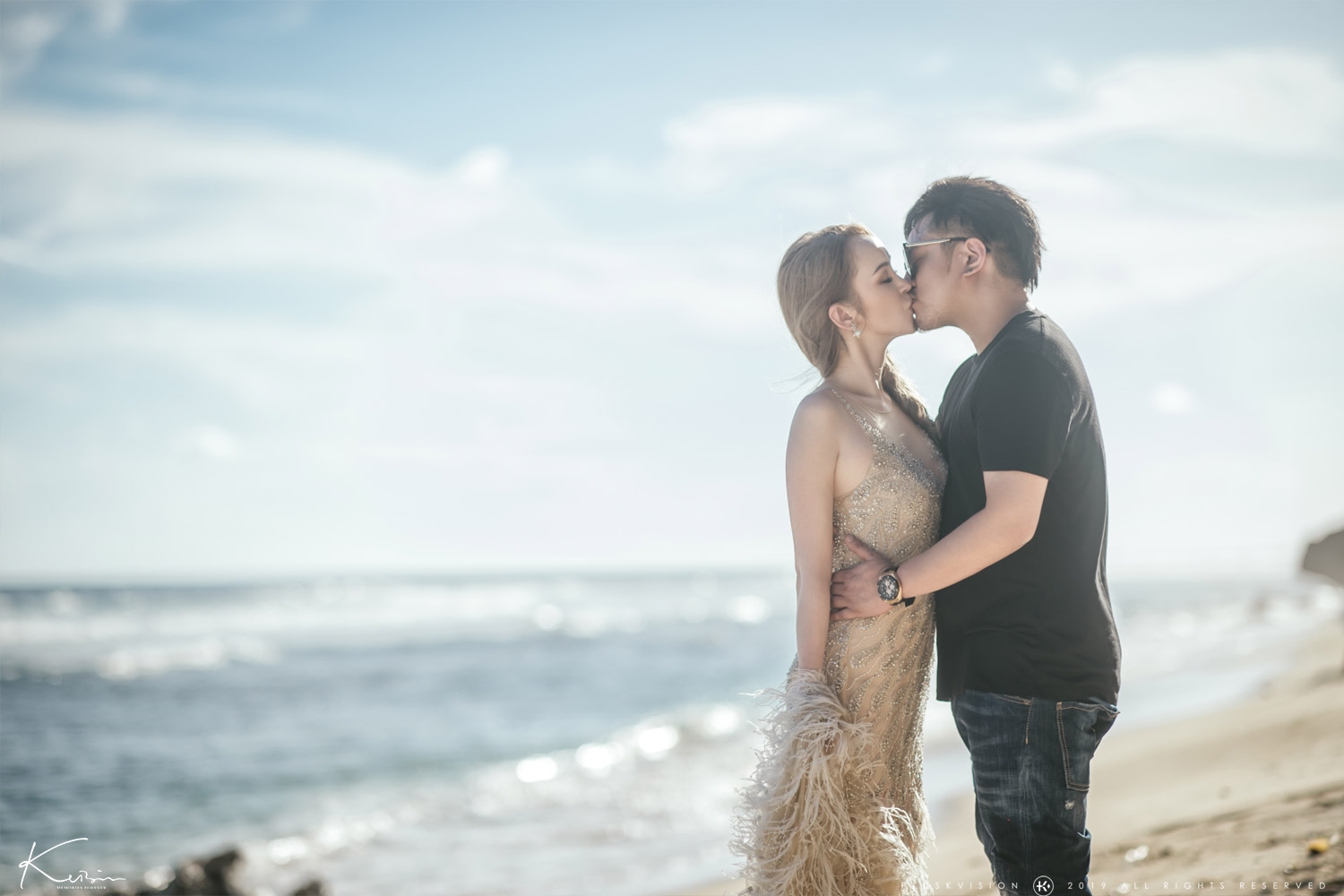 風吹起禮服羽毛、浪花聲拍打、陽光反射在他們的臉上——那是真心、是快樂、是他們為彼此做的最純粹的表情。