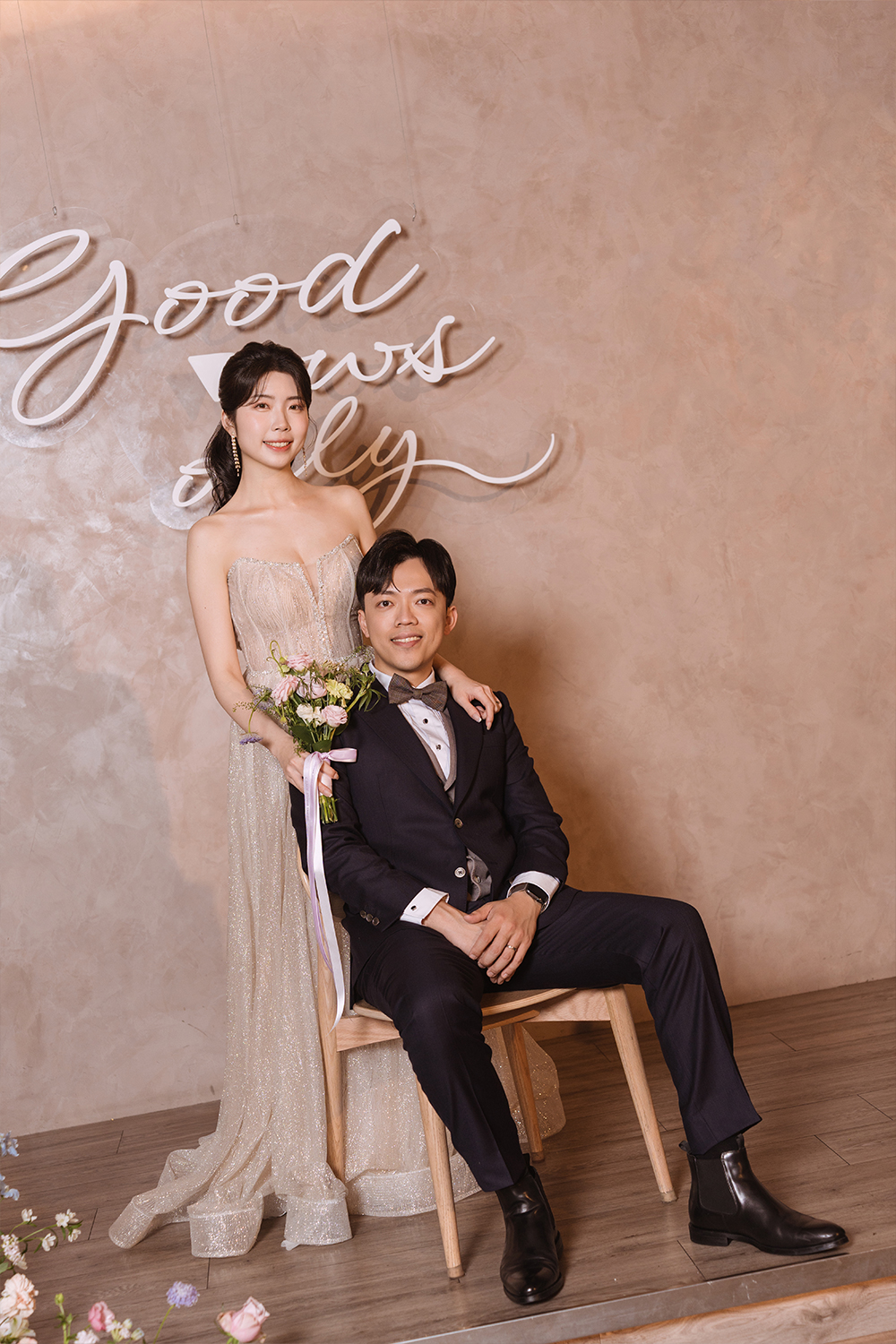 在台北的婚禮場地 Chalet V,一場結合浪漫與質感的室內婚禮靜靜展開。迎賓空間溫潤雅緻,賓客一踏入就能感受到新人精心打造的儀式氛圍。走進舞台區,牆面上以「Good Vows Only」手寫字樣,成為新人許諾終身的最佳背景。婚禮誓詞牆與低彩度的柔和花藝搭配,襯托整場婚禮的高級感與獨特風格。純白長桌上擺放著細緻花藝與香檳杯,為這場室內婚禮佈置注入靜謐而溫柔的儀式感。