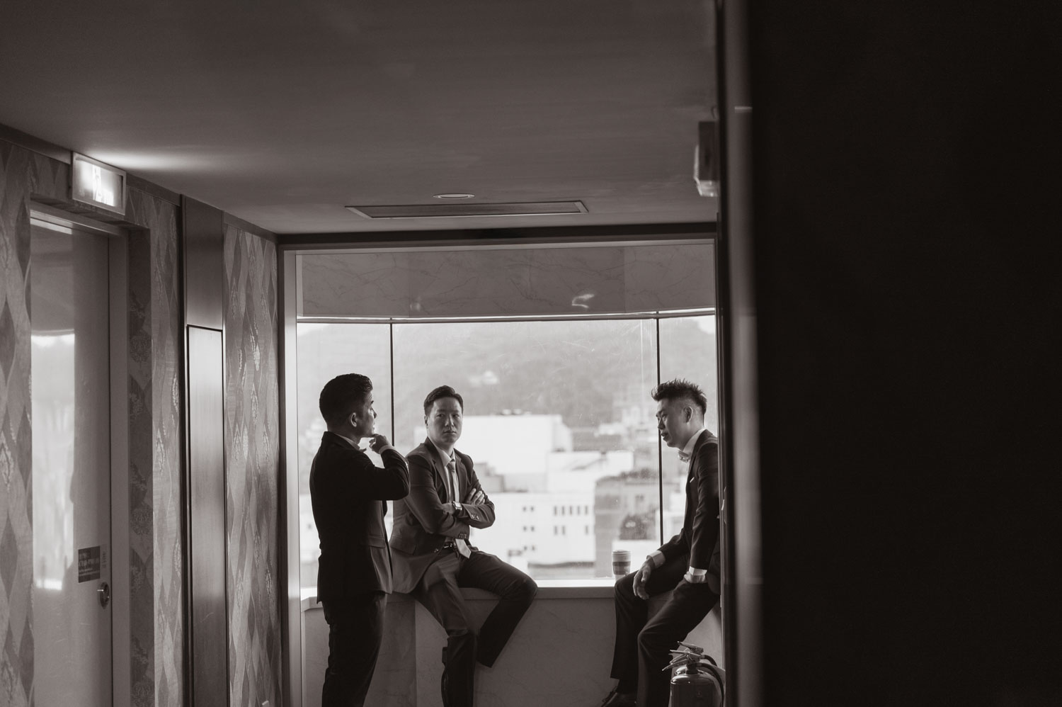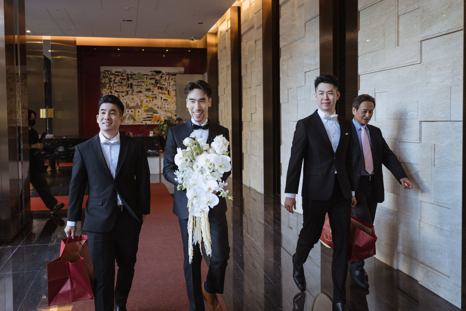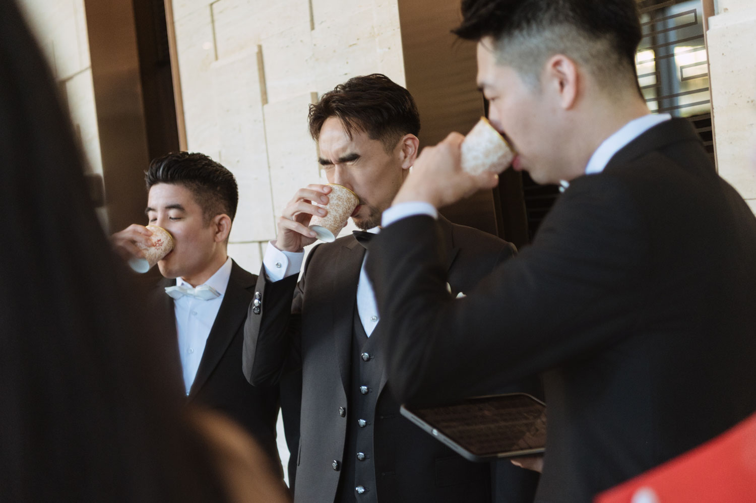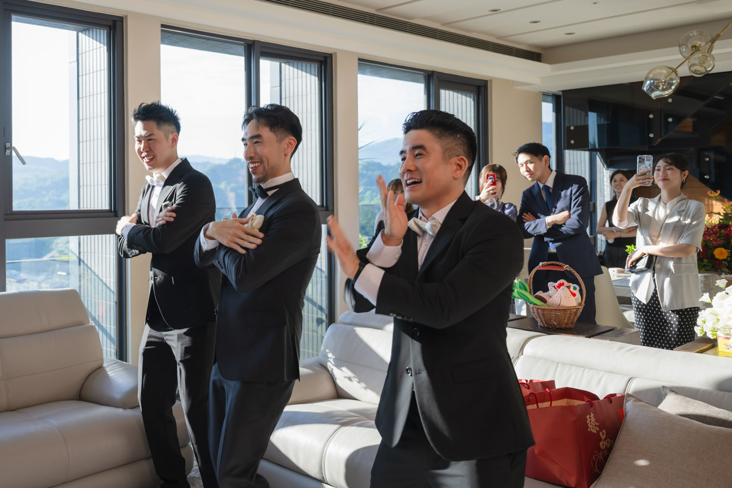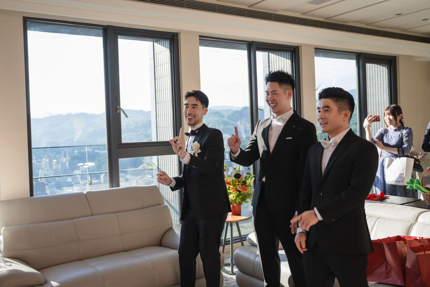 新郎的房間裡,兄弟們的笑聲伴隨著襯衫扣子與領帶的整理,那是一種獨有的沉穩與期待。