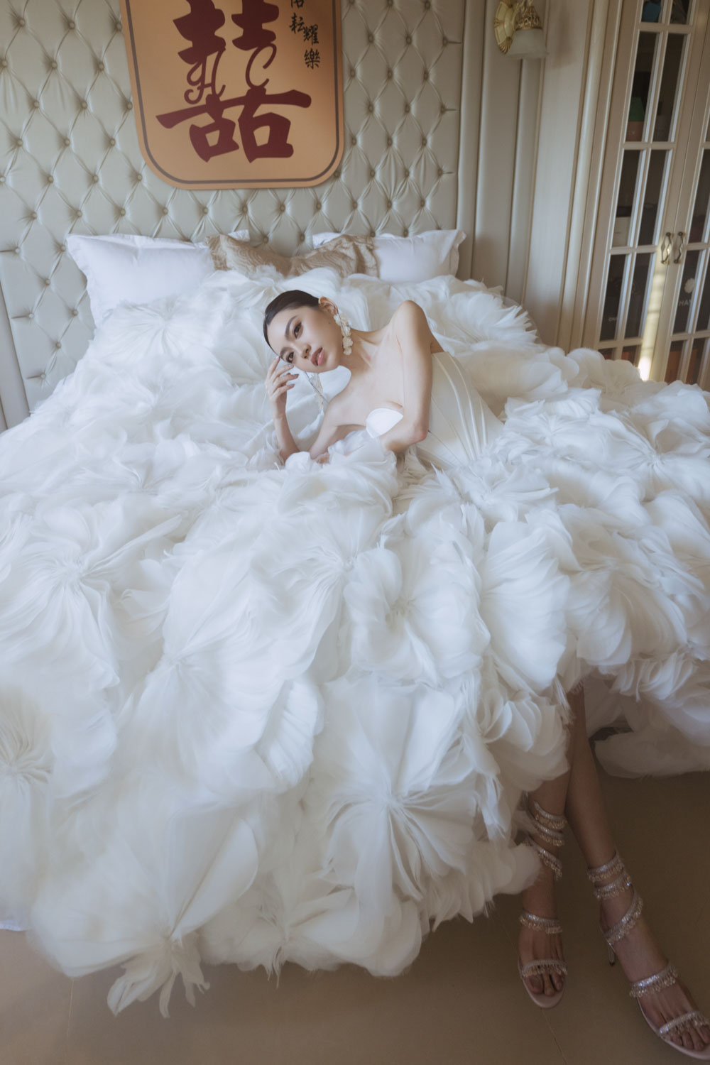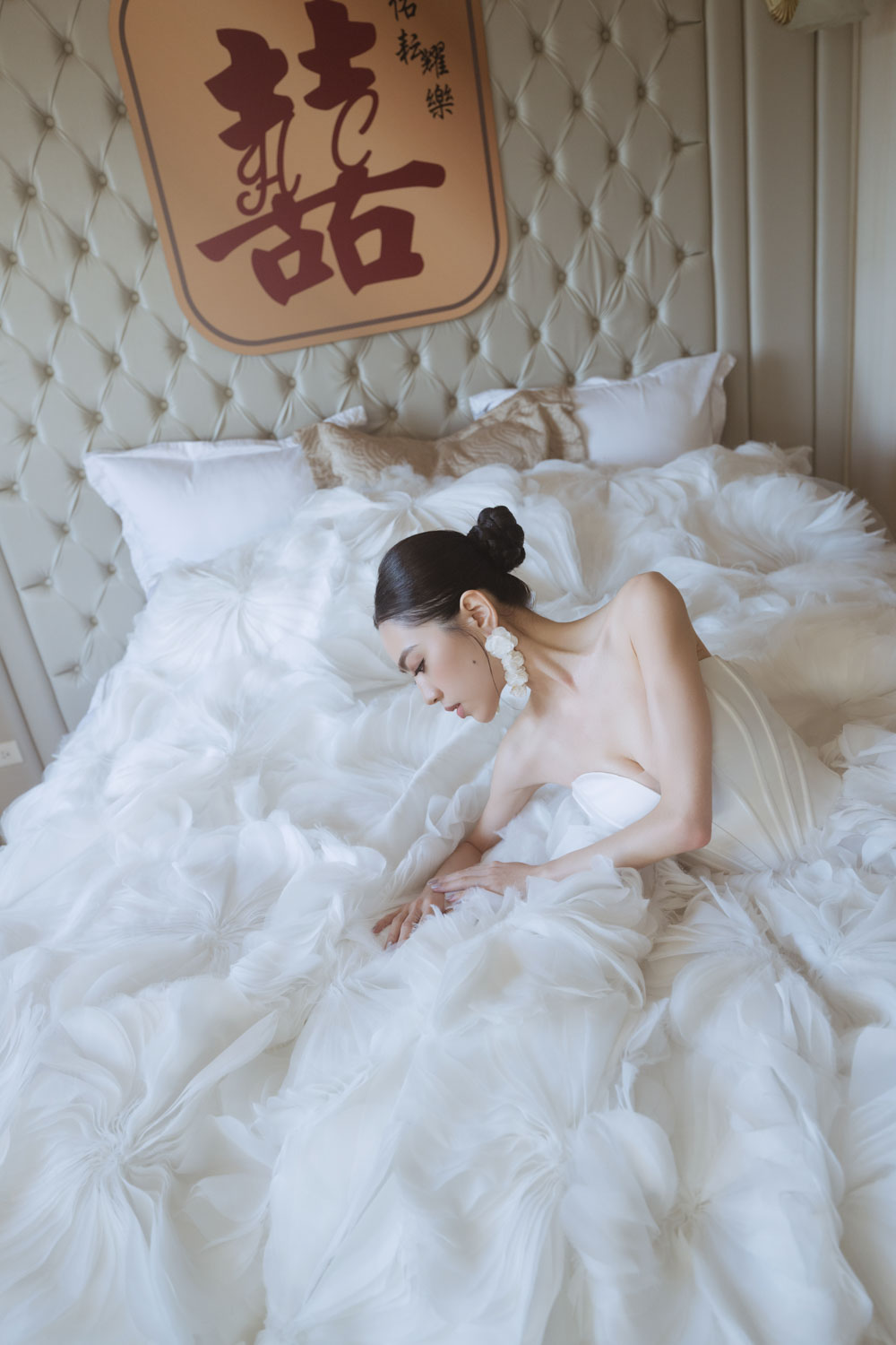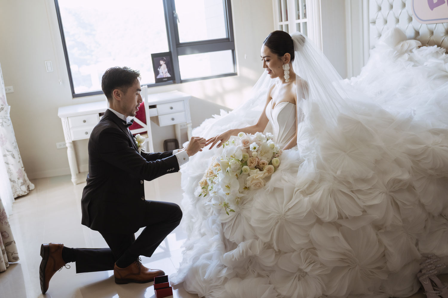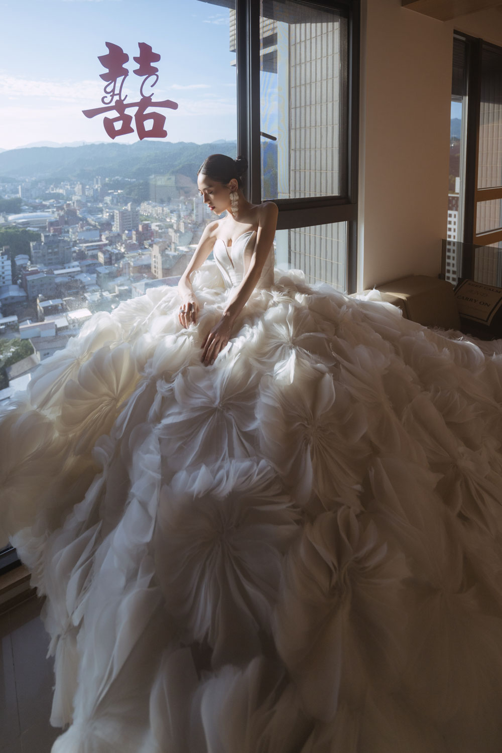 新娘的房間裡,晨光灑落在禮服的羽毛間,她安靜地梳理情緒,任光影輕輕描繪出屬於她的優雅。