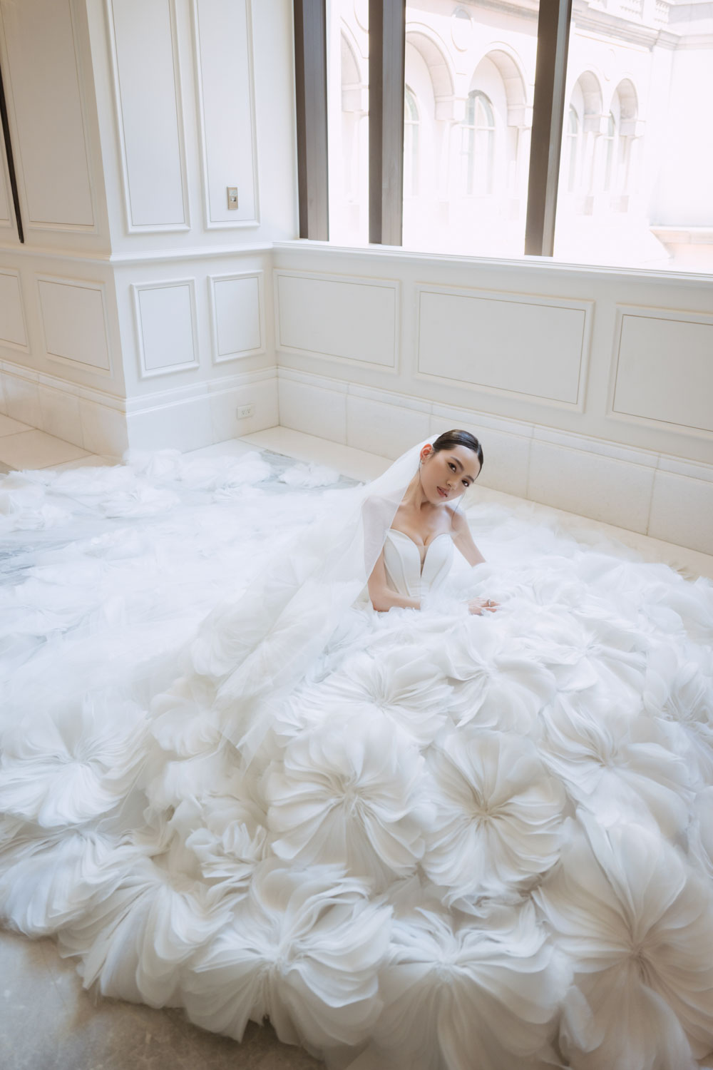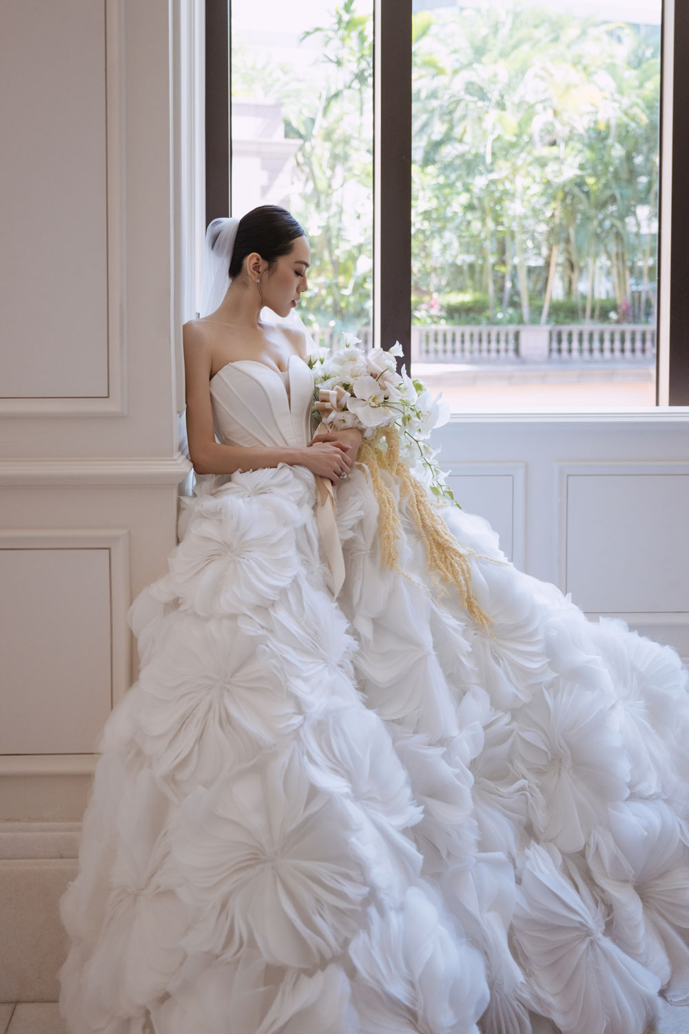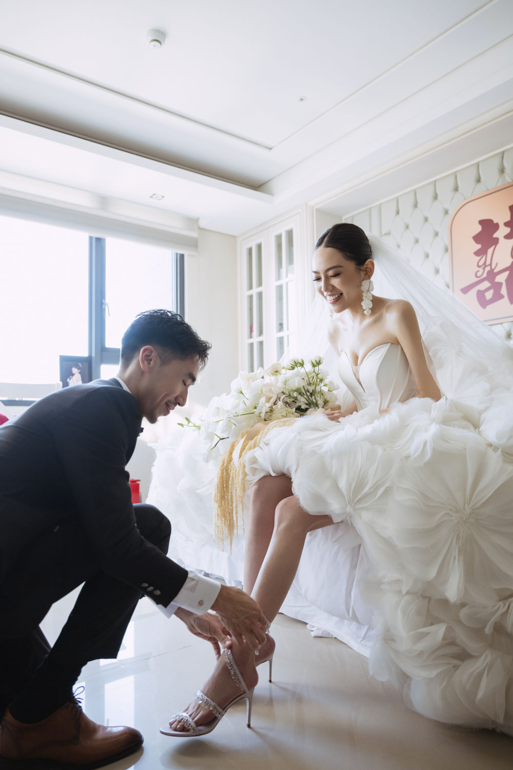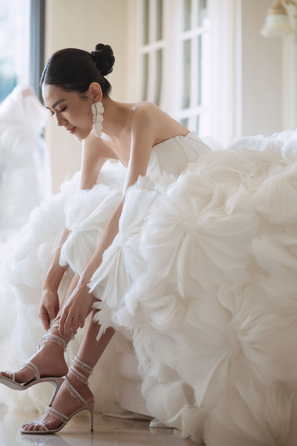 新娘的房間裡,晨光灑落在禮服的羽毛間,她安靜地梳理情緒,任光影輕輕描繪出屬於她的優雅。