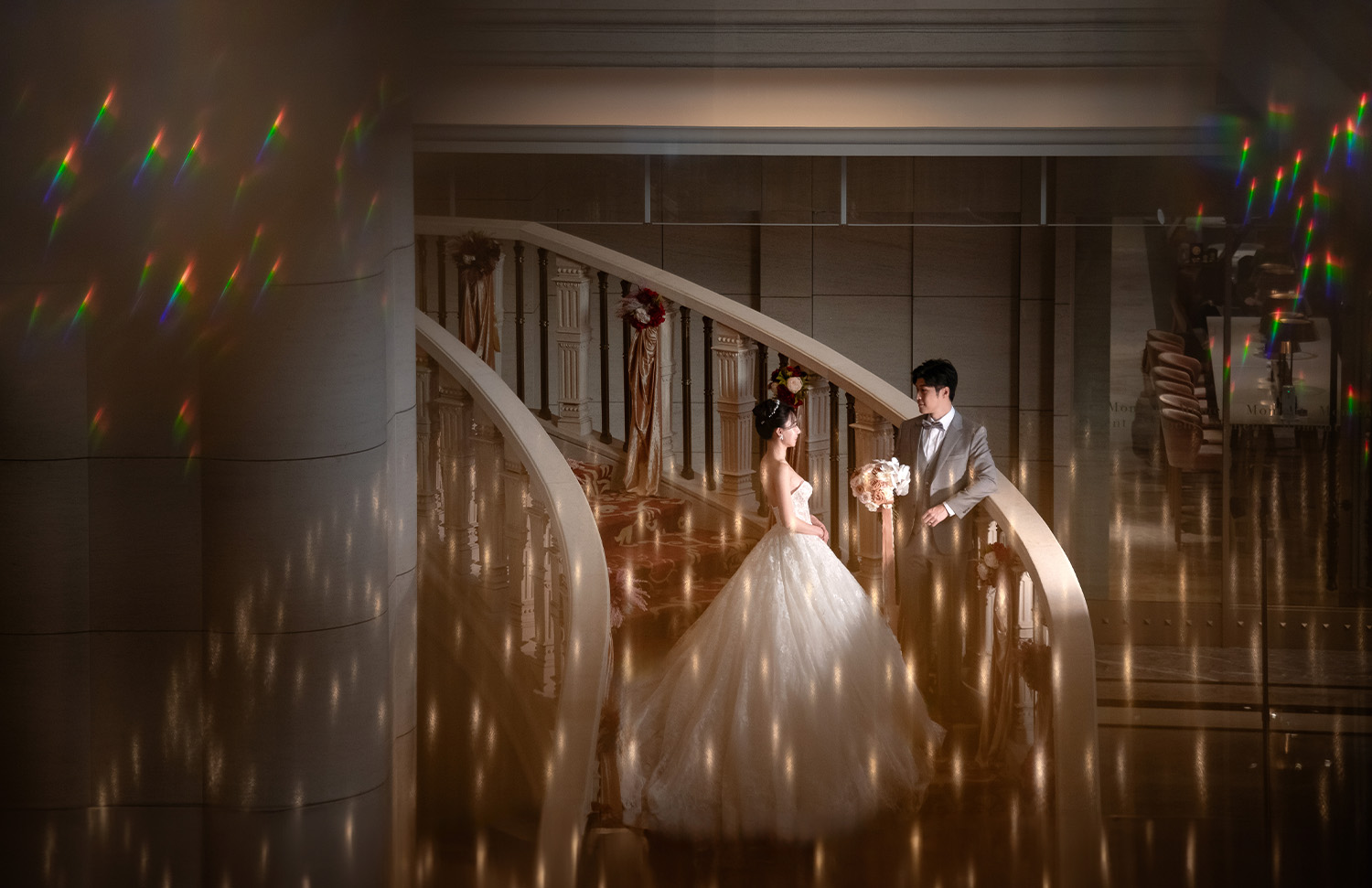 - 重點: 運用長廊的景深與水晶燈,拍攝兩人漫步或深情對望的畫面。