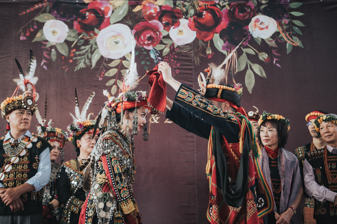 照片中記錄的是台灣原住民(排灣/魯凱風格)傳統婚禮中的關鍵時刻。 新郎身著繡有精緻圖騰的族服,頭戴象徵榮耀的飾品,神情專注地為新娘掀起紅色的頭巾。