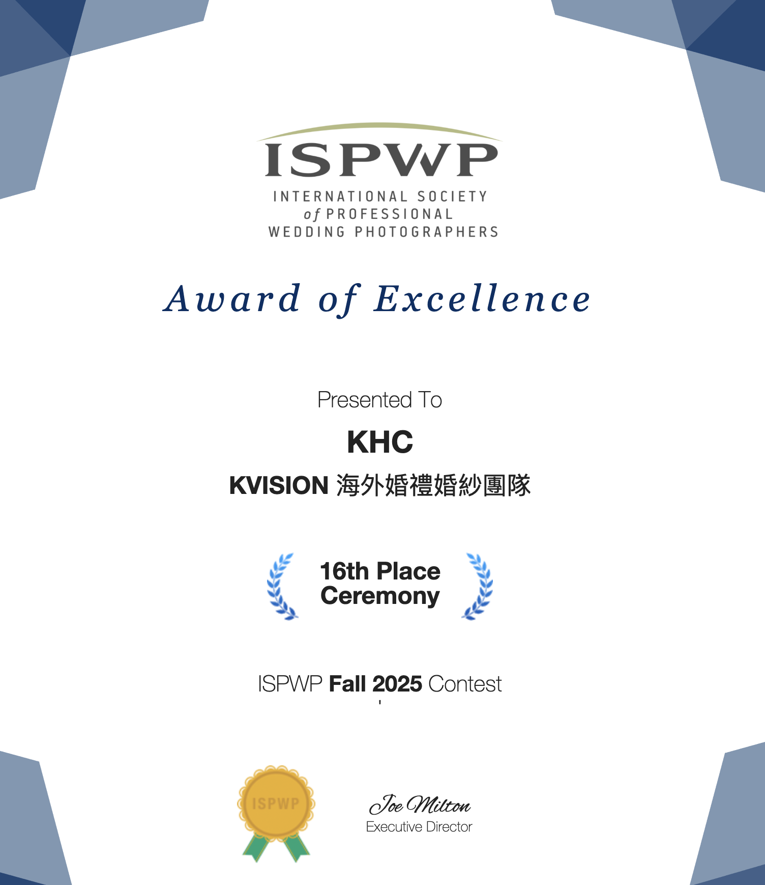 在婚禮攝影的領域中,獎項繁多,但 ISPWP (International Society of Professional Wedding Photographers) 的地位無可撼動。不同於一般付費即可參賽的獎項,ISPWP 採取「審核制」與「邀請制」。 攝影師必須證明自己擁有豐富的實戰經驗、穩定的作品品質,並通過現任會員的嚴格審查才能獲得參賽資格。因此,Kvision (KHC) 能在 ISPWP 季度賽事中獲獎,更是這ISPWP 的評審委員,不僅是台灣婚攝的榮耀,更代表我們的影像品質已通過了全球最頂尖標準的認證。