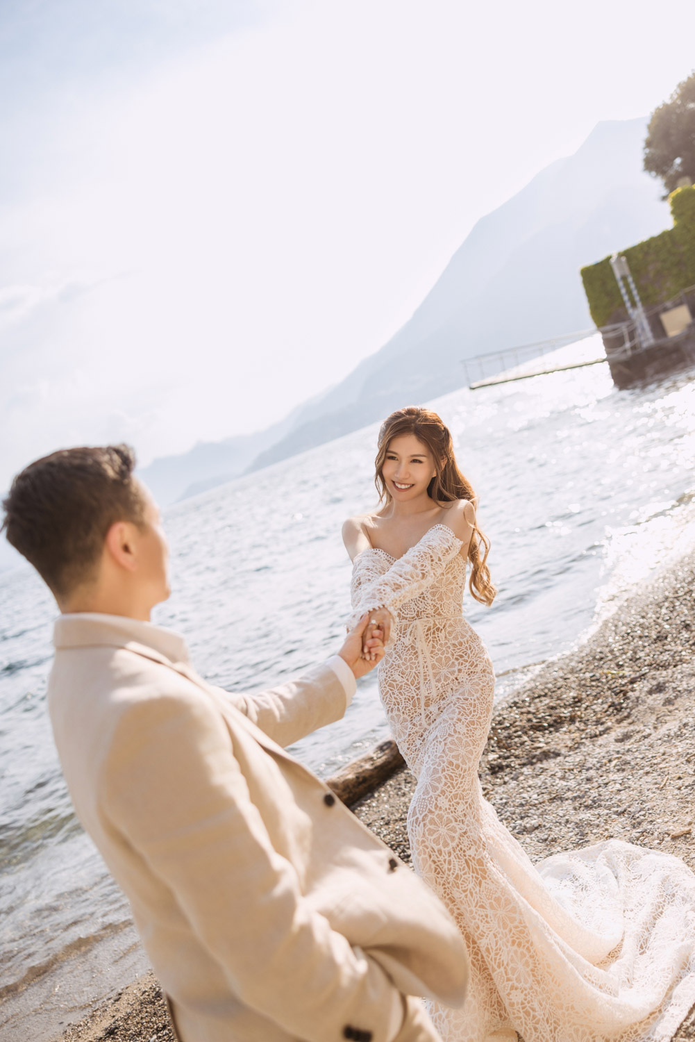 - 長頭紗或長拖尾:科莫湖微風大,飄紗效果極佳
