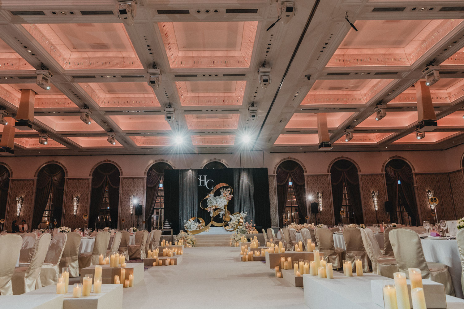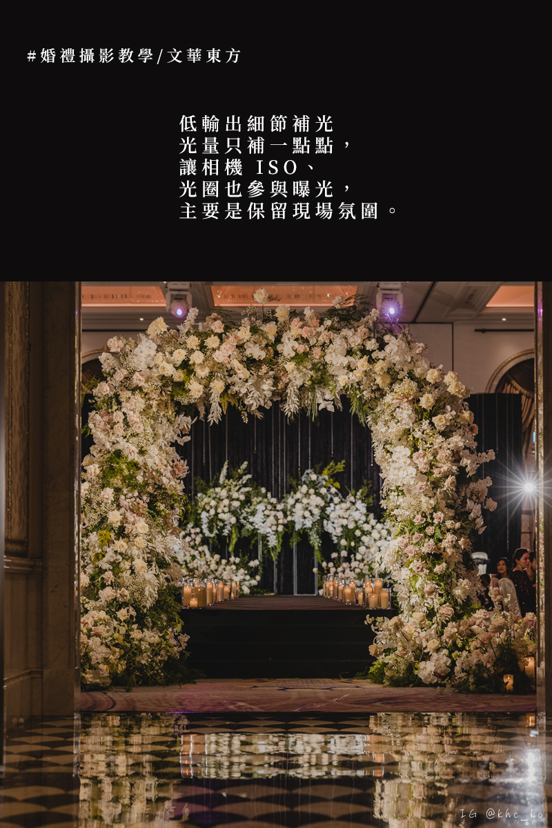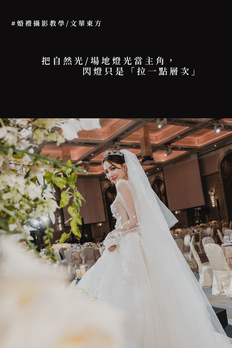 在婚禮攝影裡,五星級酒店的宴會廳是一個最能考驗攝影師功力的場域。這些場地往往空間高挑、燈光設計繁複,有時帶有大片落地窗的自然光,也可能是幾乎全封閉、以舞台燈為主的場景。如何在自然光與閃燈之間找到平衡,決定了作品能否呈現「精品感」與「時尚大片感」。